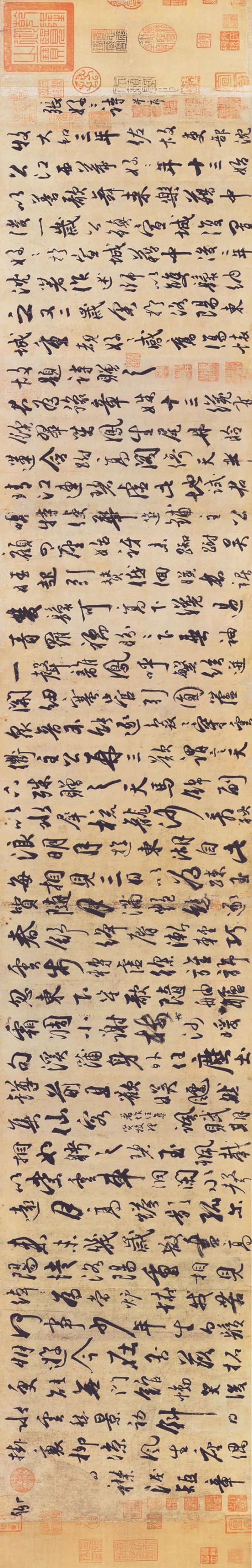 杜牧行书《张好好诗》(见下图),纵28.2厘米、横162厘米,共46行,总322 字。为杜牧大和八年(834)所书,其时年32岁。杜牧传世墨迹只此一件,该卷现藏于故宫博物院。杜牧前后三次见到官府歌伎张好好,分别是张好好十三岁时,后一岁以及后四年时。杜牧十分欣赏才艺双绝的张好好的曼妙舞姿,亦对她不幸的遭遇充满同情,在这种感情的驱使下,他写下了这首《张好好诗》。书法的形式(笔画、结构、章法)是一种“意象”,可以表现作者内在的“意”和“情”。一幅作品中,点、线、面的轻柔、厚重,委婉、质直,紧凑、铺陈等,能够具体而完整地表达作者的思想,使书写者内在的情感与外在的笔墨融为一体。这件行书《张好好诗》因是诗稿,所以反映了作者的真情实感,由此更得朴实无华之美。正所谓“诗书统一”,可以看出,杜牧直抒胸臆、浑然一体的厚重之“气”贯穿于整件作品之中,此作的风神骨气也因此而产生。从全帖布局来看,此卷书写自然,行款之间疏密有致。字与字的距离不等,行与行略微参差,整篇灵动自然。墨迹的末二句,虽因伤残缺“洒尽满”“一书”五字,然而不伤书诗的整体精神。通篇气势连绵,笔墨酣畅。再看此卷字的结构。《张好好诗》在朴质稳健中透露出姿媚的形态。结构安稳,不刻意摆布,明显地呈现出凝重端严的特点。如第三行的“籍”字,上方的竹字头很大,占全字三分之一的位置,下部紧缩;第四行的“宣”字,宝盖头几乎占全字的一半位置,下部很小;第七行“之”字下面一捺写成一平点,明显地表现得上大下小;第十一行“生”字也是上部特大,下部特小,比例反差很大。虽然如此,但字的上下左右部分“力”的分布却基本平衡,如“牧”“故”“歌”“宣”四字,都是上宽下窄,下窄部分也都站得住,如人的两腿能承载人的身躯。在用笔上,笔画劲健、硬朗,转折处近似孙过庭《书谱》中的行笔。字的形式可以表现内容的意趣。这幅字的结构、布局、笔画形态表现出柔中寓刚、刚柔相济的自然之美。“柔”,是《张好好诗》主要的风格。作品中饱含着杜牧对张好好深厚的情感,在书写过程中,好好的美好形象仍在杜牧心中,因此也情不自禁地流露到笔墨之中。“柔”是和谐,不是柔弱、轻靡,因为其中也包含了刚强的因素。“刚”,是杜牧性格的自然表现。杜牧26岁中进士 ,由于秉性刚直,不屑于阿谀逢迎当政的权贵,在作了多年幕僚之后,才担任了黄州、温州刺史,中间也曾入朝任过监察御史、左补御史、左补阙、司勋员外郎等职,但为时不长,最后官至中书舍人。杜牧一生仕途,不甚得志。《宣和书谱》中有对杜牧这样一句评价:“刚正有奇致,不为龌龊小谨,敢呈列大事,指陈利弊,尤切时务,于诗情致豪迈。” 的确,杜牧也是著名的诗人,他的一首《秋望长安》:“楼倚霜天外,镜天无一毫。南山与秋色,气势两相高。”表现出刚健清新的气质。杜牧行书《张好好诗》与他上述诗作刚健清新的风格是相通的,都是柔中寓刚,境由情生。“书,心画也”,是这幅作品所表现出的风格的内在缘由。杜牧行书《张好好诗》的书法有王羲之书法结体的风范,又有孙过庭《书谱》的笔调情致。董其昌跋此帖“大有六朝风韵”,说的是作品风格与时代传统的关系。张怀瓘评王羲之、王献之父子的书法说:“子为神骏,父得灵和。”“神骏”更多为阳刚之气,而刚中见柔;“灵和”更多阴柔之美,但柔中寓刚。杜牧的《张好好诗》行书卷继承了羲、献书法的传统,表现了柔中寓刚的风格。颜真卿更多的是把献之的阳刚之气化入了自己的作品中,而杜牧在《张好好诗》里,把羲之的柔中寓刚之美化入作品。此外,书法风格与地域人文也有相当的关系。所谓“南柔北刚”,杜牧是陕西人,北方的刚强之气潜移默化地渗透于此幅作品之中。书以成文,文以载道,这是较高层次的书法艺术审美。当今,书法创作大力提倡自作诗文,这是回归经典,也是未来书法艺术发展的一种趋势。欣赏、学习杜牧行书《张好好诗》,品味其中的人文情怀,当有助于我们的书法创作。