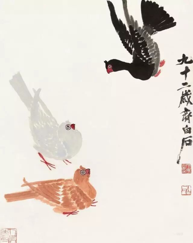 齐白石在一生当中描绘最多的就是写意花鸟。他的写意花鸟曾受吴昌硕的影响,但却超越吴昌硕,始创“红花墨叶”一派。把自身的笔墨手法与民间美术有机地结合,雅俗共赏。充满了生活的情趣,具有很强的感染力。《丝瓜小鸡》这可是农家院落中最为平凡的一幕,图中几颗丝瓜仿佛从架上垂下,下面几只小鸡为争夺一只蚯蚓追逐跳跃。在表现手法上,仅几根粗细不同的线条把丝瓜的质感表现得淋漓尽致,同时以淡墨点染丝瓜,使它与瓜叶形成对比,达到丰富画面的效果。小鸡用浓墨点染,笔法简练,描绘的小鸡形神具备中带有一些稚拙。画面中留有大面积的空白,以此给人留下想象的空间,他的画俗而得雅赏。他以其独特的艺术视角和表现技法创作了许多表现普通人日常生活的绘画作品,正是他不同于常人的平民情节的自然流露使得他在中国的画坛上大放光彩。