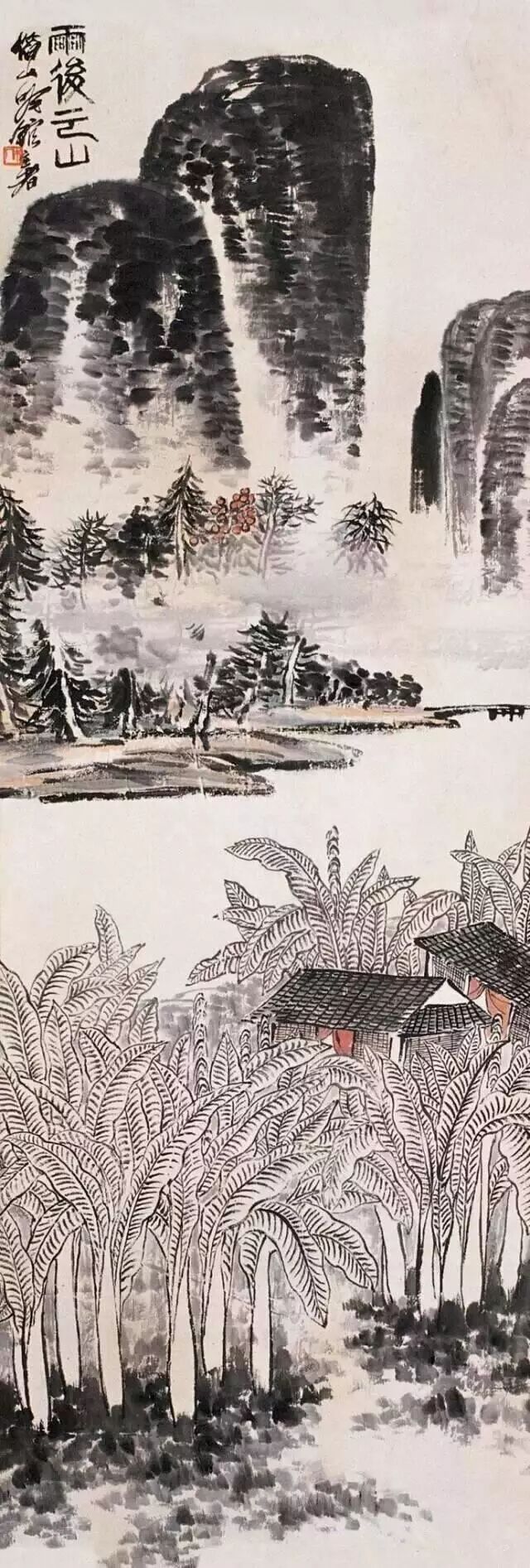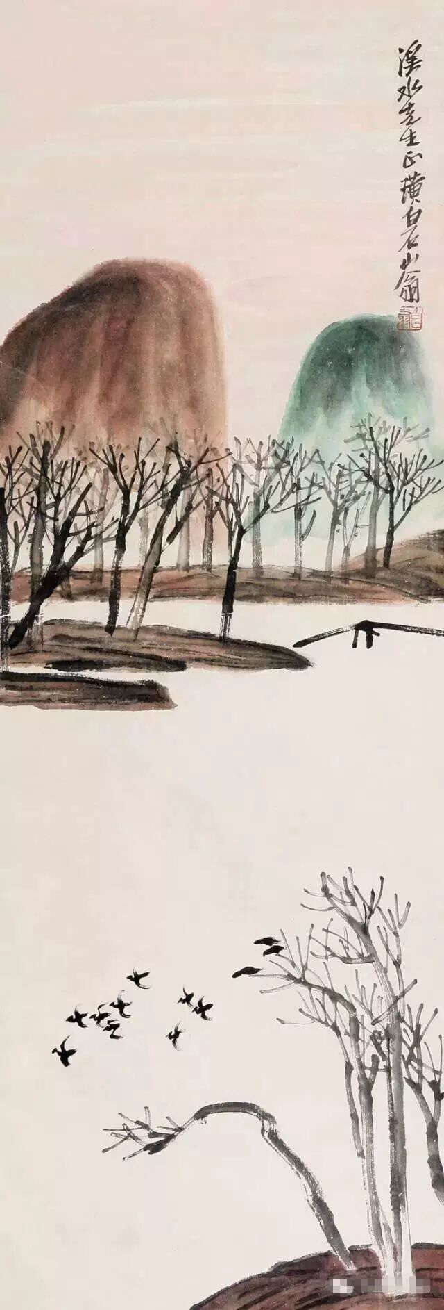 齐白石最初的山水画启蒙是从《芥子园画谱》中获得的,它对齐白石的山水画创作产生了重要的影响。清代汤贻汾曾说:“到眼云烟且静看,师人不若能师物。”在一番游历之后他才懂得画山水画必须要让自己的视野开阔,要去见识真的山真的水,才能抓住其本质特点。而“四王”固然在笔墨技法上经过千锤百炼,但却因为缺乏对真山真水的实际感受,所以,无论其如何地经营位置其作品总有一些局限性。比他们幸运的是,齐白石经常受到朋友的邀请去游山玩水,开拓新视野。通过旅游他积累了很多的山水画稿,并整理编成了《借山图卷》。而在此之前的一些局限在他十年的“衰年变法”之后便完全地突破了,并且有所超越,显示了高度的概括、综合和象征性。