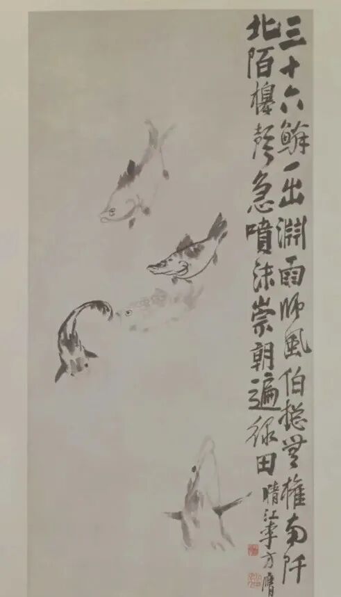 再看八大山人的《鱼鸟图》,说是鸟,但有鱼的尾巴;说是鱼,又有鸟的翅膀。对此可以有两种解读。一是八大山人作为明宗室后代,明代灭亡对他来说可谓国破家亡,清初又实行极端民族政策,“留头不留发,留发不留头”,八大山人这样的前朝王孙,只能出家做和尚,意为不留头发,并不是承认清代政权。从这个角度理解,他经历了跌宕起伏的身世悲剧,内心非常悲凉,如果想到“海阔凭鱼跃,天高任鸟飞”这句古诗,会感到海再阔,鱼也没法跃;天再高,鸟也没法飞。再一种则从大的禅僧身份来索解,意在不执著一物:鱼和鸟是可以转化的,这件作品的题跋就是引用了庄子的《逍遥游》:“北冥有鱼,其名为鲲。鲲之大,不知其几千里也;化而为鸟,其名为鹏,鹏之背,不知其几千里也。”这种大胆的想象,也并非凭空而来,而是有文献典籍的依据。