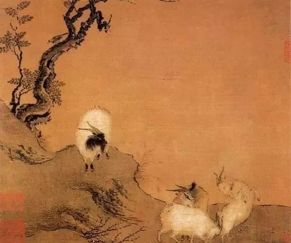 南宋画家陈居中的《四羊图》中,嬉戏玩耍的两只小羊活泼可爱,母羊慈爱地欣赏着两个孩子的玩耍,公羊则站在上面显现出比较严肃的样子。这幅画充满了亲子之爱,是在画感受,也是拟人化的。