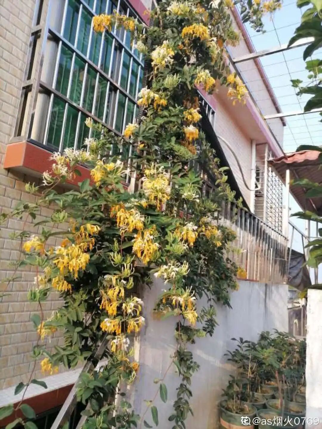 花花小区有个大爷,在小花园的围栏上养了一圈金银花,最近每天上班下班,都能闻到香香的味道,不过还没等着花花摘一把泡茶喝,就下了一场雨,花瓣全被打落了。