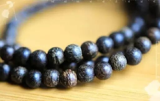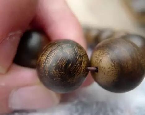 商家会在前面加上很多名词,如“海南药沉”,“越南奇楠沉”“极品沉水手串”,等等,这些都是无关紧要的。接触过沉香不足一个月的朋友们,都能很轻松的辨别出来。 告诉新新手们一点:看这种沉香,细看它有没有油脂线。 常跟大家说,真沉香,即便是油脂到了饱和状态,也不可能出现全黑的沉香。这就像一个乌托邦,理论和实际生活中,都是不存在的。