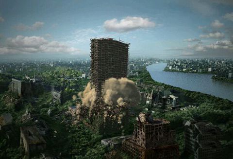 其次,人类建筑也将快速腐朽。首先是那些木制房子,所有这些房子都将在100年内消失。而由玻璃和钢筋建造的城市摩天大楼,将在200年内倒塌。砖、石和混凝土结构的房子将持续更久,但也将在1000年后坍塌。如果没有地震,桥梁也许能支撑200年,但即使是世界最大的拱桥最后也会在1000年后倒塌。250年内,人类建造的水坝也将坍塌。人类留下的重金属污染数百年后也将逐渐被稀释。