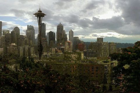 即使像纽约这样的繁华大都市也要不了多长时间就会被大自然瓦解,生命力顽强的树根会顶翻无人踩踏的人行道路面和撕裂地下管道,纽约中央公园将有成群的野狼出没,商业酒吧的啤酒池内则蛙声四起。为地铁抽水的水泵一旦停止工作,极剧上涨的地下水会将公路和人行道下的泥土冲走,从而使公路和人行道变成沟壑,就像1609年的曼哈顿一样,纽约至少有30到40条河流。布鲁克林植物园副园长史蒂文?克莱曼斯称,200年内所有纽约公园的排水沟内会落满数吨落叶,如果避雷针锈坏再遇上雷击,中央公园或其他任何地方几十年未割过的齐膝杂草将在瞬间引燃,从而使整个纽约遗址付之一炬。