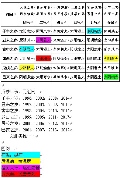 《温病条辨》的第一条,把《黄帝内经·六元正纪大论》中关于温病多发季节的内容归纳了一下,曰:“辰戌之岁,初之气,民厉温病。卯酉之岁,二之气,厉大至,民善暴死,终之气,其病温。寅申之岁,初之气,温病乃起。丑未之岁,二之气,温厉大行,远近咸若。子午之岁,五之气,其病温。巳亥之岁,终之气,其病温厉。”