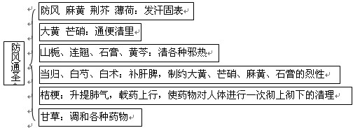 防风通圣丸由以下药物组成:防风、荆芥、麻黄、薄荷、川芎、当归、炒白芍、白术、山栀子、酒大黄、芒硝、连翘、石膏、黄芩、桔梗 甘草 滑石、生姜。一共18味,看似比较复杂,但仔细看,又不外乎三类:一类是发汗的,如防风、荆芥、麻黄、薄荷,一类是通大便的入大黄、芒硝,一类是清热的,如山栀子、连翘、石膏、黄芩。其余的,川芎、当归、白芍、白朮补肝、补脾,桔梗升提肺气,甘草调和各种药物。这可以说是一个面面俱到的方子,既养肝脾肺,养肝就是养生气,养脾就是养中气,养肺就是养元气,它把人体的这三气一起养足,同时通过发汗排出体表的邪气,通过通大便排出体内的邪气,同时清除病邪可能造成的热。