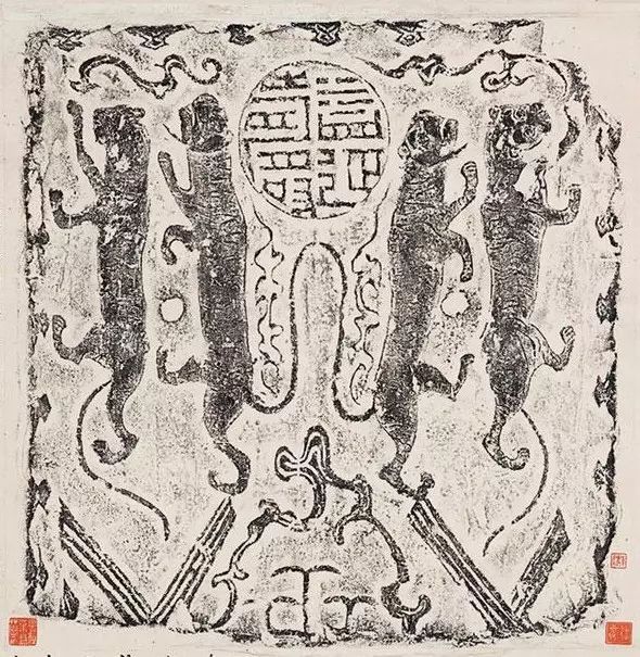 “益延寿”砖,左右各刻两只螭虎,四兽左右相背对称,形制奇古,据考证这块砖应当出自今陕西省淳化县,为汉武帝元封二年于甘泉宫兴建的“益延寿馆”之遗物。