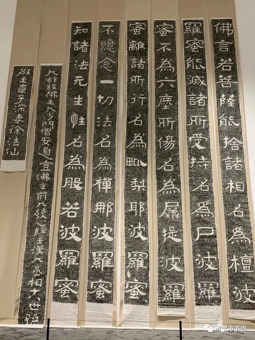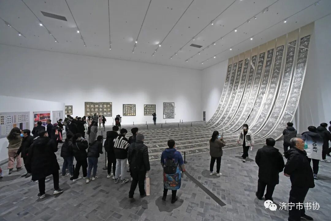展览以寻常百姓的“未知视角”切入,揭开了济宁石刻书法的千年面纱,是一次探秘书法的奇妙之旅。济宁素有“中国汉碑半济宁”“济宁汉画甲天下”的盛名,石刻书法时代早、保存好、遗存集中、气魄宏大,备受金石学家、书法家推崇。目前,济宁地区保存汉魏碑刻60余种,数量约占全国总数的一半,典型隶书、通俗隶书、行书隶书等书法类型自我独立、相互影响,完美展现出汉代书法的整体演变。济宁地区的北朝摩崖刻经以隶书为骨架,巧妙融合篆书、魏书因素,场面博大,气势恢宏,被称为“大字鼻祖”“榜书之宗”。山东省书协副主席、济宁市书协主席谢长伟介绍说:“济宁石刻书法资源宝库宏大,但梳理展示困难重重。庆幸的是,弘扬优秀传统文化正当其时,济宁市美术馆具备了展示超长拓片的场馆条件,天时地利人和使展览得以圆梦”。