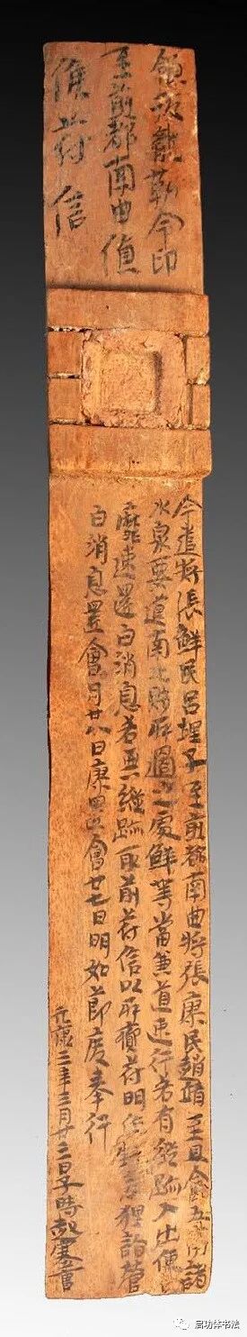 其中《流沙坠简》收录588枚,材料来自法国汉学家埃玛纽埃尔-爱德华·沙畹(Emmanuel-èdouard Chavannes 1865-1918)1913年所出版的《斯坦因在东突厥斯坦沙漠中发现的汉文文书》一书。这本书收录了斯坦因1906-1908年第二次中亚考察时所发掘的敦煌汉简、罗布泊汉晋简牍、纸片、帛书等1991枚,而斯坦因在这次考察中仅发掘的敦煌汉简就有705枚,其中纪年简166枚,最早的是西汉武帝天汉三年(前98年),最晚的是东汉顺帝永和二年(137年),时间远远超过了启功先生所看到的元康年(前65-前61)。 那么,为什么启功先生在《流沙坠简》中未看到“永和”的年号呢?我想,这可能与《流沙坠简》收录沙畹一书材料未能收全有关,也可能与沙畹一书本身收录不全有关;当然,还有一种可能,即诸如“永和”年号,虽然在简牍文字中未有显现,但通过简牍文字所载史实的考证,可以推断出“永和”之年,只是启功先生并非史学家,大概对简牍文字所载史实并未作深推细究,抑或当年史学家们尚未考证出“永和”之年。 《汉晋西陲木简汇编》还多收了斯坦因1913-1916年第三次中亚考察时所发掘的简牍,但也有类似问题。具体情况若何,存疑待考。 今天,我们所能看到的简牍太多了,诚如启功先生所言,“使人目不暇给,生今识古,厚福无涯”。 汉晋简牍在书法史上的意义,对人们的震动不啻(chì)“原子弹爆炸”。 一则,在二十世纪前,人们看到的汉代书法都是碑刻,没有手写的真迹。北宋书法家米芾(fú 1051-1107)曾有幸看到过当时发现的汉代简牍,他大为震惊,认为“河间(今河北献县)简牍乃书法之祖”。在敦煌汉简出土前,许多人曾怀疑东晋王羲之(303-361或321-379)《兰亭集序》的真假,因为汉魏六朝时期留下的碑刻书法与王羲之的书风差距太大。而在敦煌汉简墨迹中,王羲之书风已初露端倪。 二则,汉晋简牍反映了中国古文字演变的历史脉络,不但完成了对古文字“隶变”的改造,即由篆书演变到隶书,而且开启了后世的草书、行书和楷书。比如,2009年在敦煌发掘出的西汉宣帝元康三年封检(文书信件表面的一片简牍,类似今日信封),其字体已接近楷书了(如下图)。