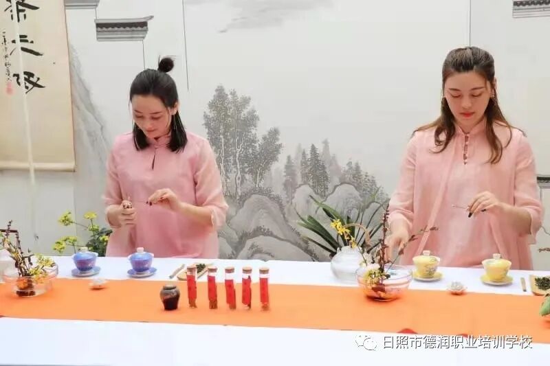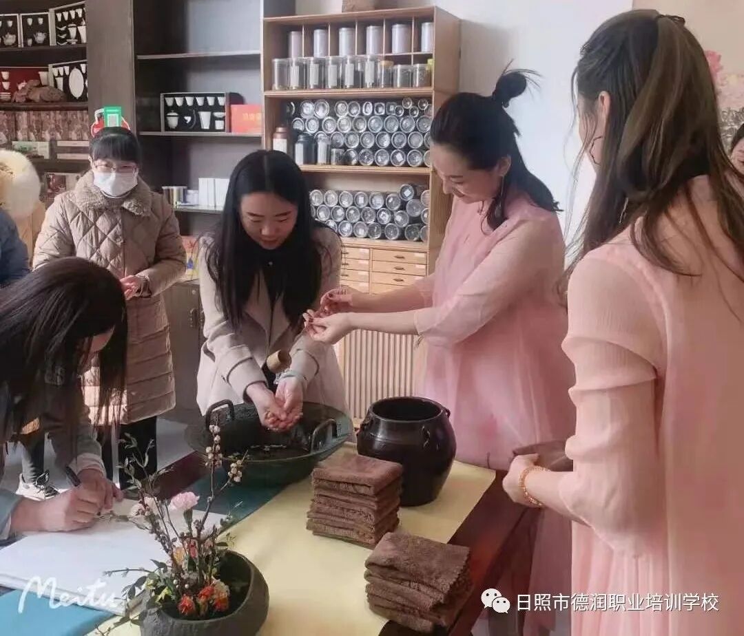 日照市德润职业培训学校常年开设茶艺师、评茶师、制茶师等行业等级技能证书培训考试。承接各单位茶艺师舞台演出,开展茶文化培训讲座,组织全国茶山茶旅茶博会参展等。培训来自全国各地茶文化爱好者几万人。日照市茶为国饮文化传播公司经营多种配套产品有:茶文化企业营销策划、茶叶、茶服装、茶器具、手机科技互联网、批发加新零售、创新科技茶衍生研发产品、茶家具、全球茶旅茶山游学等。
