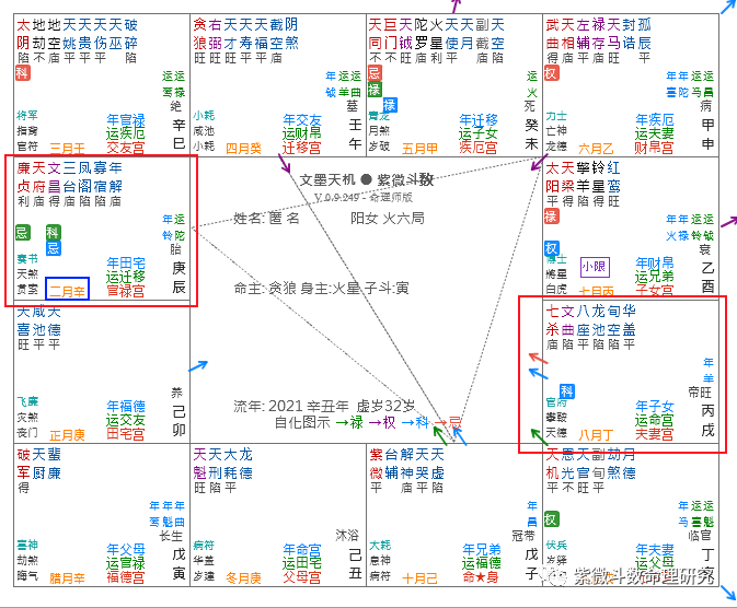 我们可以根据流年太岁干的四化来确定流年的一些吉凶方向,以达到趋吉避凶的目的,这是紫微斗数的一种简单应用。如今年2021年“辛”干的文曲化科与文昌化忌就非常容易在命盘当中形成一些特殊角度,来给大家一些启示。