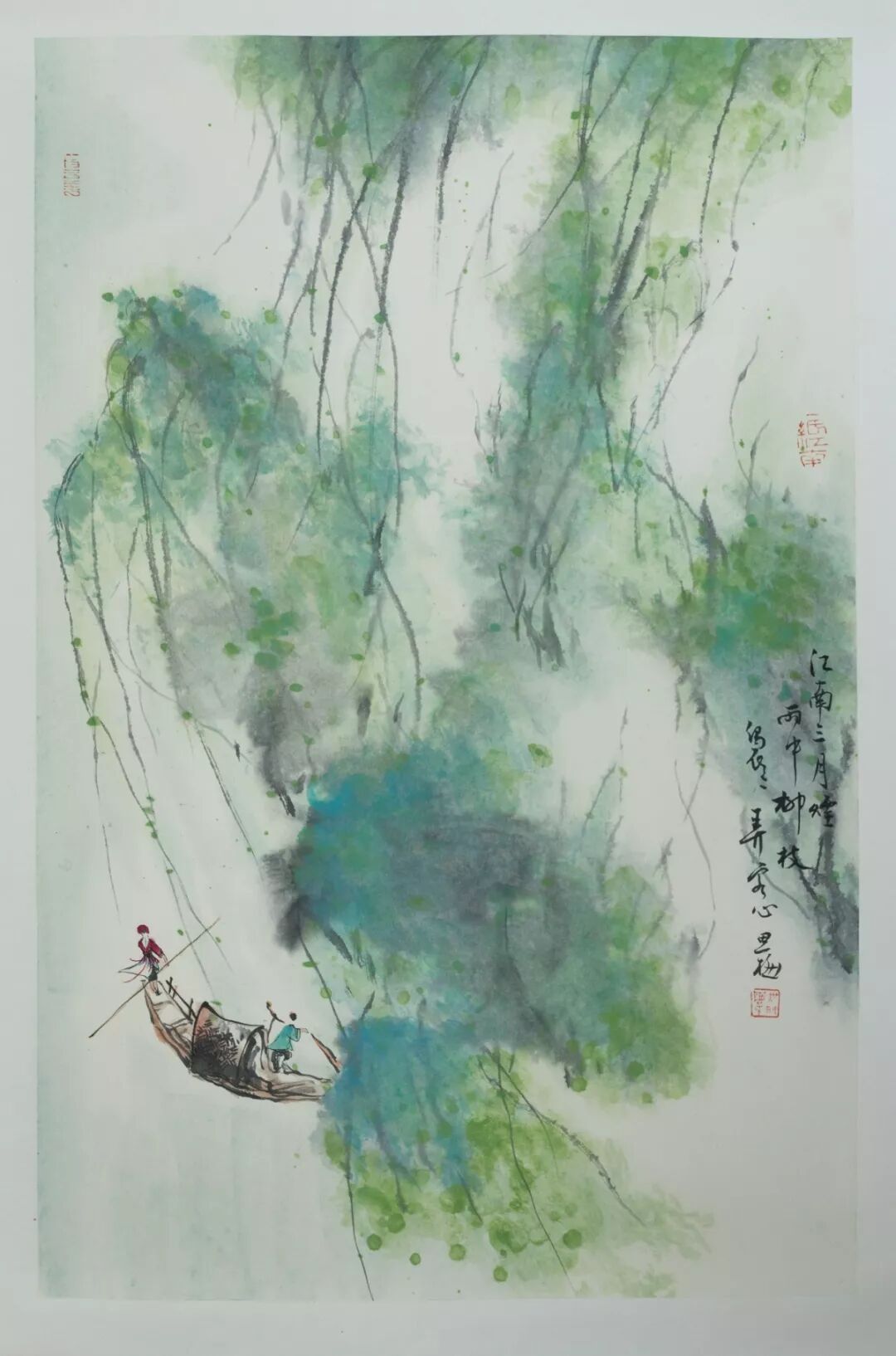 记者:青绿山水不容易画好,金箔纸本身不吃墨,色彩处理不好也容易流于俗气。您是则么考虑这个问题的?周思梅:这一组“万系列”小品青绿山水,也是我今年创作的。我共画了一组十张,称为“十万图”。这次展览上选了其中六幅展出。梅花、柳树、松柏、山涧都是江南山水常见的景色。青绿山水对着色要求特别高,在金卡上表现难度更大。近代山水画大师吴湖帆先生,对于青绿山水有一句秘诀,用苏州话讲“橄榄黄胖绿”。他笔下的青绿山水,用色温润,没有火气,构图层层递进,回环曲折。他的画境,也是我心之所往。