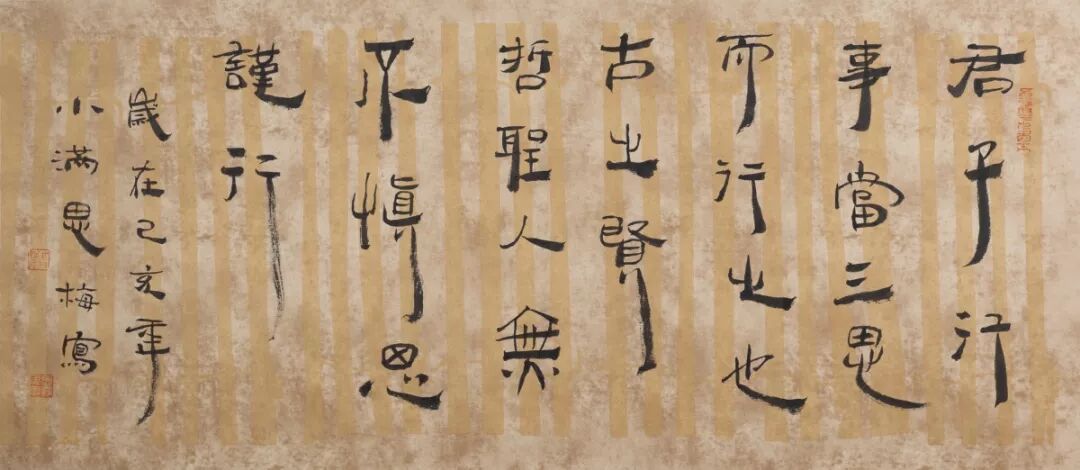 这几天,我也在考虑,可能真正出新就是要很多东西的交融,从另外的角度才能改变你原有的一些规矩和习惯的东西,才会有一些新的碰撞出来。这一点,我觉得是一个慢慢的过程,这几年随着画画基础的提高,随着生活的历练,我认识到山水、梅兰竹菊、人物、书法到最后是一种融会贯通。虽然,我目前还没有达到这种状态和高度,但我想希望用我的书法用笔来画画,用绘画线条来写书法。这个也是我写汉隶和竹简的启发。虽然,当初没有这么高的认识,我这是歪打正着,所有的兴趣爱好的结果。正好落在其中的一个点上,我觉得这个对我很重要,对我以后的绘画也会有很大的帮助。同时,我又从临摹古人山水中去探索,提升自己的绘画技法。用心法补充技法,而书法就是我的心法。在这个浮躁的社会中,我与古人交流,让我愈发安静,单纯。我希望我的作品也能在这个浮躁的社会中给予读者观众营造一个可以内观世界的山水境。我特别喜欢用一方章:古人山水今人梦。临古作品是与古人对话;画水墨时,我仿佛看到了倪云林,他站在太湖边那种落寞寂寥的神情,而我就在他的身后,我也仿佛看到了沈周、文征明、仇英、王宠,他们泛舟太湖之上的悠游。我还想沿着古人的脚步丈量他们笔下的山水世界,然后寻找到自己的山水路径。我的作品很传统,很规矩,相比现在时尚的当代艺术,我比不了,也做不来此类创新。我自认为把老祖宗的东西吃进去,消化了,吐出来就是新的。因为新不是想不出来的,它是一个水到渠成的、不自觉的结果。