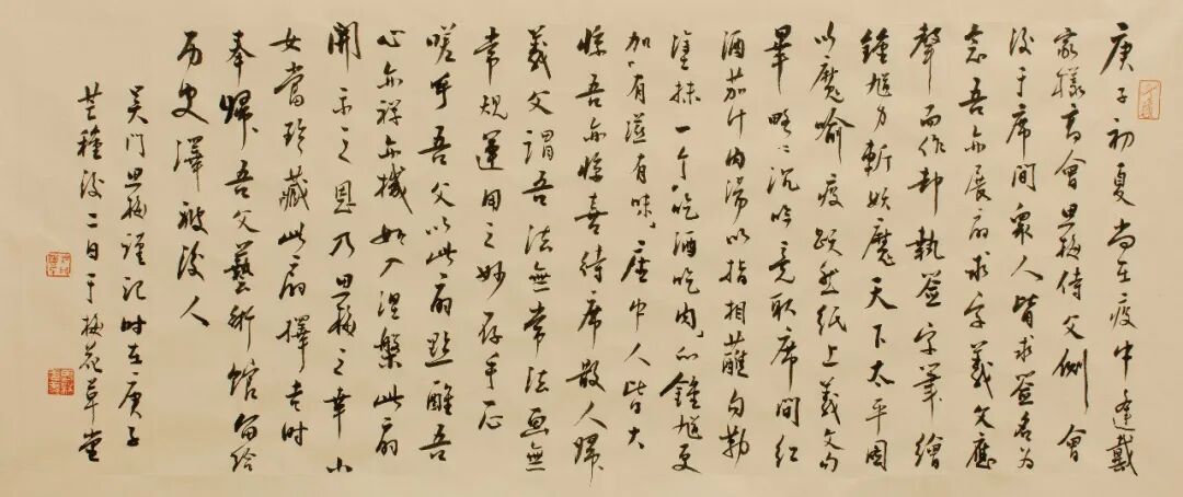 记者:在山水、梅兰竹菊之外,您还在尝试人物画,这次展出了仅有的一幅人物画《灵山法会图》。请谈谈画这幅作品时的状态。在这方面还有什么计划?周思梅:我非常有幸得到一代人物大师戴敦邦先生的提携和指导。戴老一直希望我能好好读《红楼梦》,画《红楼梦》,不枉自己生长在姑苏城这天然的条件。这些时我也一直在读,但我始终不敢动笔,觉得自己画人物不行。但我想我应该动起来,从人物线条开始。刚好戴老在我写的小楷《金刚经》长卷上画的引首白描《灵山法会图》也是戴老精心之作。我就想把它放大临摹。从线条上先把自己提高,把基本功先弄起来。我把这想法一说。老爷子非常赞赏。于是,就开始临摹放大。画了一个多月,这期间,也是反反复复拿到上海不断听取义父的意见作修改。在义父的指导下完成了这幅画,这次作为一件重要的作品展示出来。虽然和老爷子的要求还有很大的距离,但画了这张画,我增加了信心,我会在人物线条上继续下功夫。这件画画的很辛苦,这个体会和画山水不一样。我画山水就像跟古人对话,和他们一起游山玩水,画梅兰竹菊就是表现文人情怀,笔墨趣味。但画这《灵山法会图》特别理解了古代民间艺人的情怀。前段时间,我来北京之前,给老爷子写了封信,我说以前您一直叫我去敦煌,其实我没有懂,没有理解,也并不知道敦煌真正伟大在哪里。但是,今天我突然觉悟,开始觉得我有点懂了。我有想去敦煌的冲动,也有想画敦煌山水人物的激情和想法。这个展览结束后,我可能会在这上面多花时间,多下功夫。到目前为止,我人物画上没有很好的进步,一直也是内心觉得愧对义父戴敦邦先生的厚爱和期望。记者:好。希望您继续深入人物画的研究和创作。谢谢!