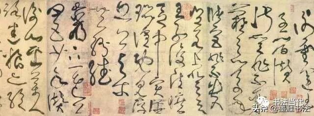 草书要先立大调子,强调韵律和节奏感。在一幅字内,其跃动现象,时而如大海波涛,时而如平湖微波,因而在用笔上就不能像其它书体用力均匀。有时则须大起大落以通身之力送之,有时则轻提出笔偶相带过。有的则速到迅雷不及掩耳连绵不绝。如张旭《古诗四帖》中“难之以万年储宫非不贵岂若上登天”。有的则缓以会心,笔断意连。如“王子复清旷,区中实譁嚣喧”。乍徐忽疾,瞬间即换的用笔同时,还要骤提即顿的迅速交替,方能达到体意连绵,笔意奔放,有旋律和节奏的特色来,如果提高到创作上来说,才能使你的笔墨淋漓尽致的抒发情怀,表达个性。疾徐的交替和提顿的转是随着字的态势和连绵起伏的气势以及感情的变化而不断进行的,只能意会而不能言传,大家今后在实践中去体会和验证。
