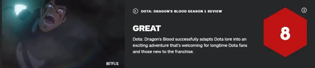 IGN也给出了8分的好评:这是对《DOTA2》成功的动画改编,也是绝佳的《DOTA2》入坑之作。