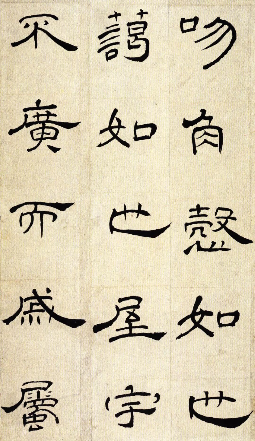 其隶书,取法 汉碑,功力深厚,如《曹全碑》、《乙瑛碑》、《史晨碑》、《娄寿碑》、《夏承碑》等都有取法,而以《曹全碑》为最。此碑“秀美飞劲,不束缚,不驰骤”,丁敬得益最多,但他贵能博采广蓄,孕育变化。求新、求变、求自我,乃丁敬一贯艺术思想也。