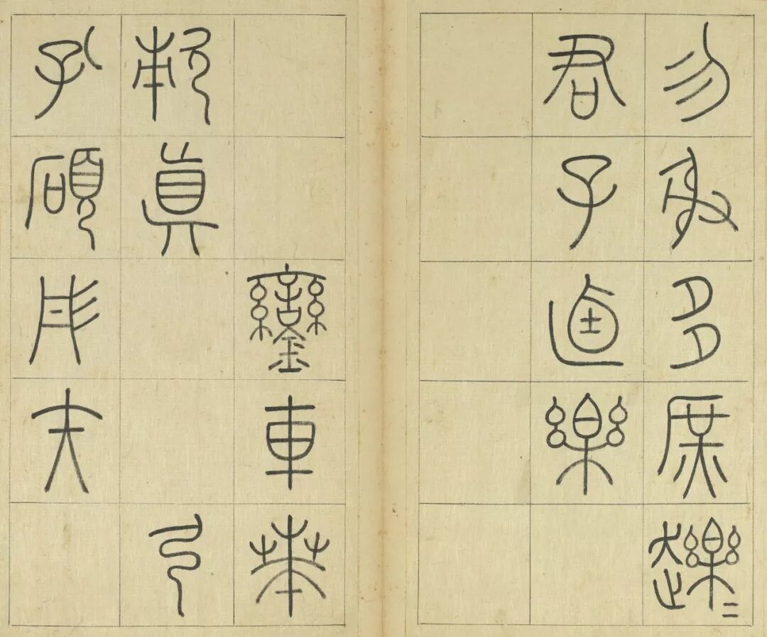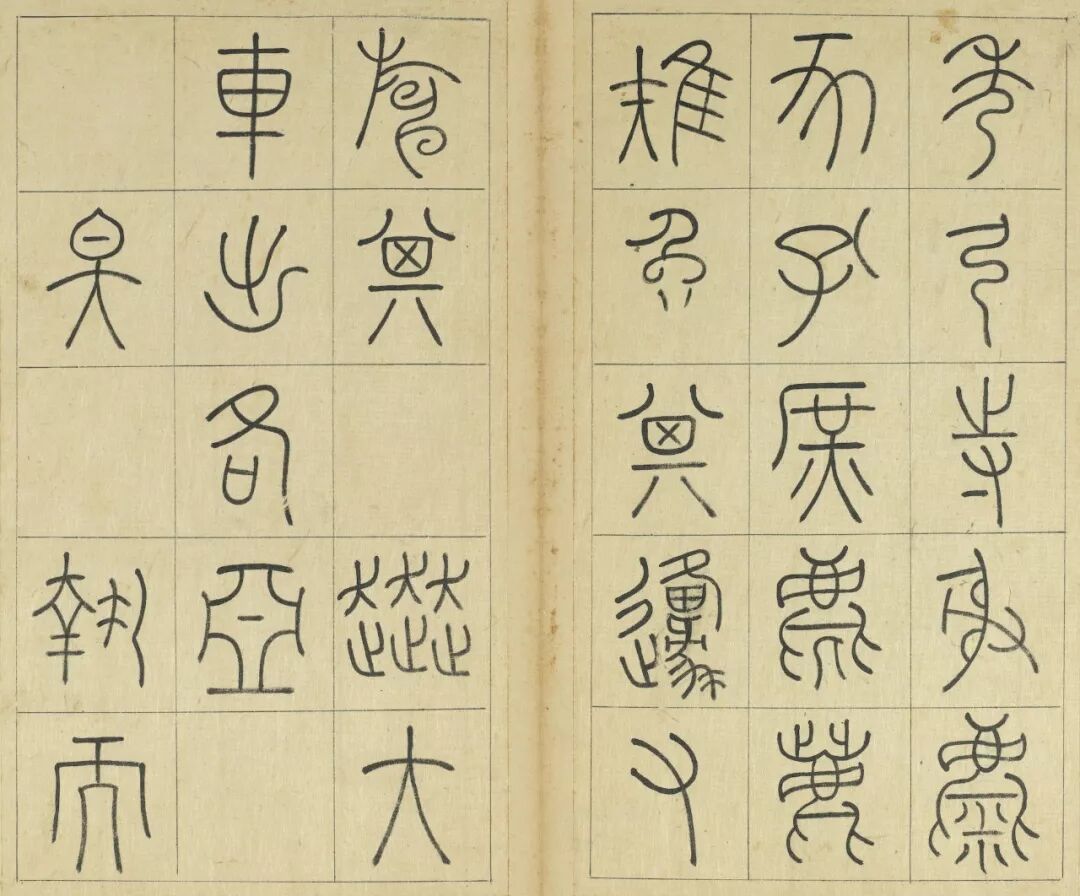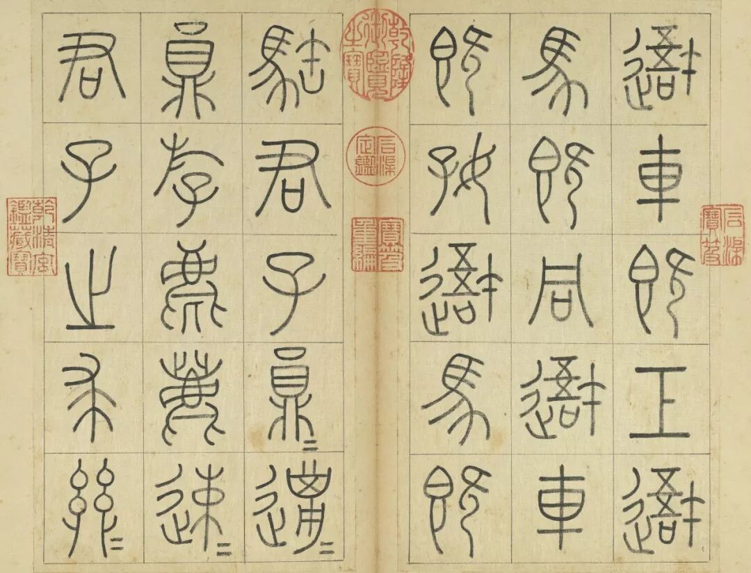 王澍(1668-1743),字若林,號虛舟,江蘇金壇人。康熙五十一年(1712)進士,官至吏部員外郎。王澍是一位著名学者,其书法亦冠绝当世。王澍在篆书方面,有卓越的突破和贡献的。其结字匀称端庄,法度分明,规整森严。笔画虽纤细,但笔力内凝,入规出矩。字字结构稳健,火候纯熟,颇有法度,乃为一代书法高手。他那凝重醇古的艺术个性,被世人所称道。正如清代书法家翁方纲所说:“篆书得古法,行书次之,正书又次之”。这种评价是十分恰当的。《临石鼓文册》,纸本,篆书,26cm×14.7cm×22cm,台北故宫博物院藏。此册写于雍正八年(1730),经比对与《积书岩帖本》相同。学者考究,此本于乾隆五十五年(1790)入藏,是年乾隆重定石鼓,故册末附王杰等众臣说明。王澍临本较元明两代拓本字数更多,且篆法多摹自宋薛尚功,加上王澍早在康熙朝即以篆书闻名,因此此本与内府收赵孟頫音释之元拓本,经乾隆皇帝鉴定同为石鼓文参考的标准本。