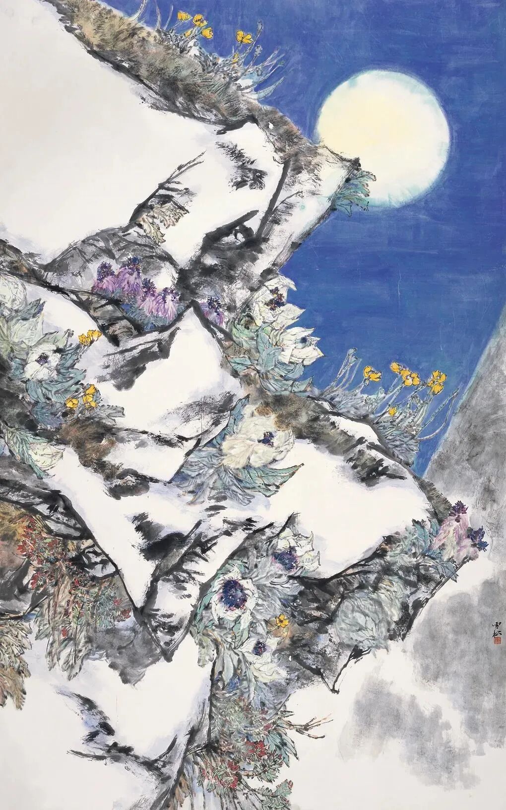 创作《天山月明》这幅作品,源于我在西藏 3000 多米的雪线上第一次看到了盛开的雪莲。当时在蓝天和雪峰的映衬下,雪莲圣洁和顽强的生命力给了我十分震撼的印象。回来之后,我开始反复构思表现雪莲题材的作品。雪莲是一种十分奇特的高山植物,它分布于中国高寒地带,生长于高山雪线附近的岩缝、石壁和砾石滩中。雪莲有很多品种,以天山雪莲最为美丽。在文学、影视作品中,也有多种表现雪莲的形式。在这张画里,我釆用石青平涂背景的方法来衬托明月的皎然和雪莲的圣洁,在主体花卉刻画上突出雪莲的造型,同时穿插着描绘了和雪莲共生的一系列高山植物,如红景天、野罂粟、水母雪莲等,它们在雪山之间形成了一个完整的生命群落,相互依存,和谐共生。