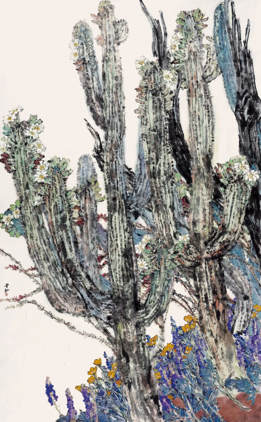 我从2000年后开始近20年以花鸟画为主的创作阶段,因为我一直关注生命在自然中的本体状况。我们现在应该膜拜宋代花鸟画,宋代花鸟画是公认的高峰。我觉得宋代花鸟画最打动人的地方就在于它表达自然,没有人类干预的生命状态,这也是宋代花鸟画给我带来的深刻启示。它描绘了一种无人之境,一种没有人类痕迹的、天然的生态之美。所以后来我画大尺幅的花鸟画,去了很多没被人所破坏的地方写生,比如东南亚和非洲热带雨林,地中海的沙漠,中国的西藏和大西南的一些地方……我是想寻找这种自然中生命的状态,感受植物原始的状态。这也是受郭怡孮先生的大野山花理论的影响。带着一个关于花鸟画的课题考察与写生,我想创作的就是自然本真的生命之美,这跟人们赋予花鸟画的折枝、花卉还是有区别的。我在创作中展现了自然的壮美,他们在存在中经历着生死消亡,试着用绘画去诠释生命与死亡的转变,我觉得植物生命中永恒的、本体的一些东西可以给人类带来一些新的思考。这些年我一直在创作两个系列,一个是“生生不已”系列,一个是“雨林”系列,这两大系列涵盖了我十几年的创作。首先是“雨林”系列,“热带雨林”是我和几位艺术家朋友这些年做的一个课题,我们现在已经把全球十大雨林走了一多半,我觉得雨林是远离现代社会、远离人类文明的遥远的存在,完全处于一种自生、共生的状态。这些年我把花鸟画放在这种大的背景环境中去思考,画了很多大尺幅的绘画,植物互生、共生,形成了一种和谐、共生、相互依存的自然状态。“生生不已”系列最早来源于我上大学的时候去云南画的竹子,竹子经过多少年之后,衰老枯死地垂下来,新竹生长出来,穿过这种腐朽衰老,继续生长,这种生命之间的轮回转换,是我思考的主题。