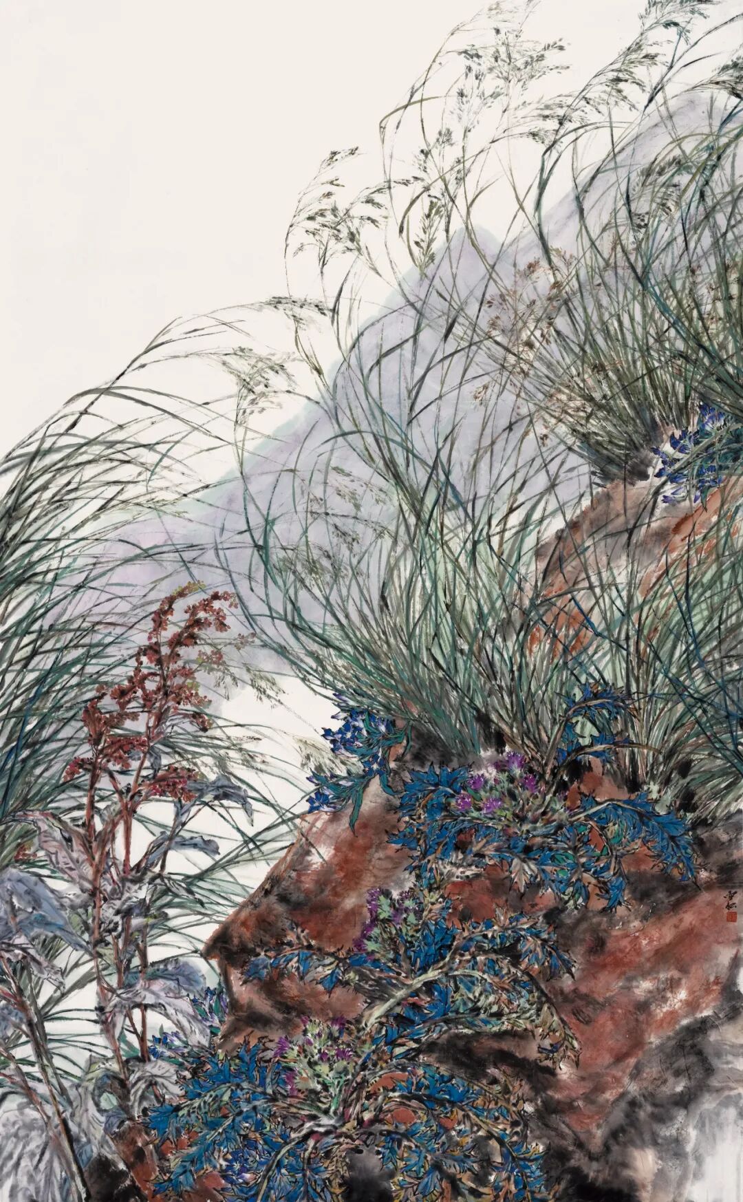 我创作大幅画作,3—5米,是以完全放开、完全松弛的状态去作画,有错误的时候可以有空间往回去找办法改变。画小画易遇到因尺幅小没有太多回旋的余地这种问题,一定要将精彩的地方设计在前,在绘画过程中没有很多机会变化了。小画所表现的题材也不太多,对于题材的选择也有要求了,有一些题材的确不适合画小、画局部。中国本土的植物,是传统常见题材,适合用小尺幅去体现它们的美。古代的传统题材一方面有其寓意,另一方面也是植物本身形体有利于表现,有其利于展现的造型因素。所以,不论画的尺寸大小,每张画的题材和立意都有所不同,尽量让每张画独特,形式上更丰富。中国画本身就是高度概括的,有很多抽象的、意象的东西在里面,必然会有时代的、个人的审美情趣存在。你看《千里江山图》,王希孟画这个画的时候,还那么年轻,不到 20 岁就画得那么好,这就是一个时代,一个时代的绘画不是一个人的能力,一个时代的传承叠加起来才能达到这样一个高度。你看米开朗基罗、贝尼尼,都是很年轻就有了很惊人的作品,这就是时代的力量,一个艺术的高峰是一群大师造就的。所谓的创新,就是在历史原来的基础上,又添了新枝新叶。一定要正视历史,能有幸在几千年的历史中留下一点点东西,就很了不起了。中国人说技是以人传的,不是以技传的,技法一定要化成自己的才有效,又要适用才行。就像当年冰雪山水技法,表现东北的山水树木很适合,后来有些人拿来画南极什么的,那就有点吓人了。“技”首先就是技法和技巧,“道”可能就是万物运行的道理。艺术和其他行业不同,其他行业可能没有“技”,有顿悟就能体会“道”。但画画本身就是一个讲技术的事儿,技术首先就是要掌握技法与技巧,你把最初的基础掌握之后才能上升到“道”的层次。而且画画就是要给人视觉上的展现,如果没有充分而扎实的表现方法,可能就没办法承载你内心“道”的存在。