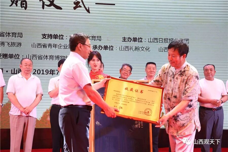 7月28日,山西省体育局局长赵晓春,山西日报报业集团党委委员、副总编辑任灵杰,山西省体育博物馆馆长朱强及省城众多著名书法大家、文化学者、新闻媒体代表300余人,共同见证了庄严而隆重的捐赠仪式。山西省体育局局长赵晓春表示:“杨拴明助力二青盛会、挑战吉尼斯世界纪录荣誉成功,用他坚韧不拔的毅力和超强的书法技艺,创造了他个人挑战成功的奇迹和二青会在山西体育赛事史上的奇迹”。