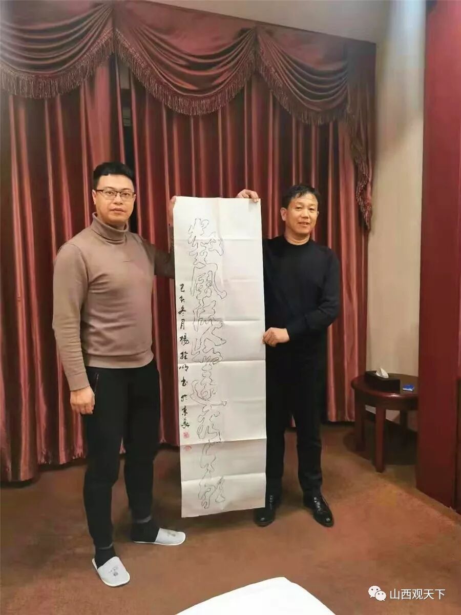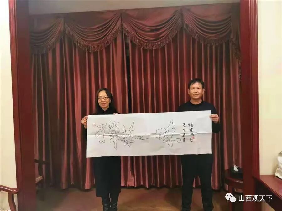 △ 图为杨拴明赠送叶剑锋先生一笔空心字作品