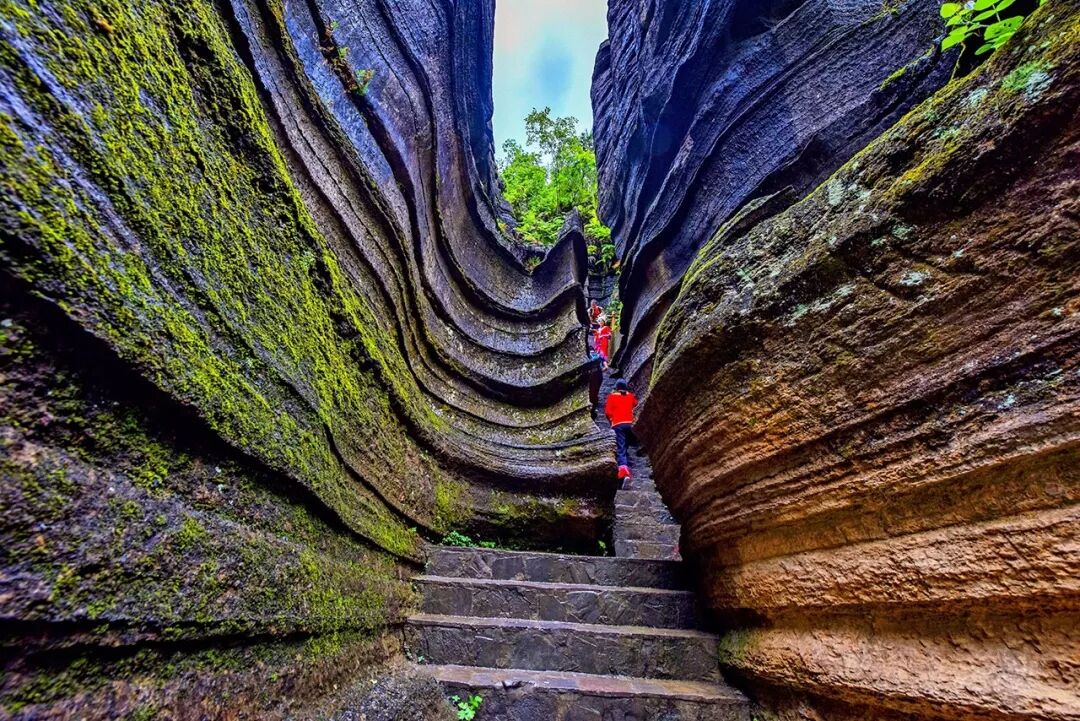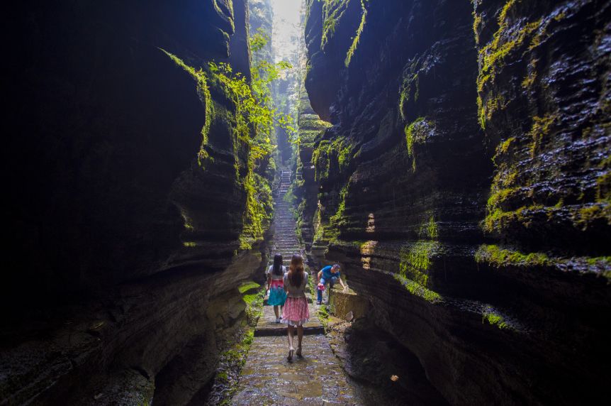 下山后游览地球上最美丽的伤痕【大峡谷云龙河地缝】(游约2小时),这条地缝形成于2.1-2.9亿年间世界上极为罕见的“U”字形段崖,这是世界上唯一两岸不同地质年代的地缝。右岸为1.8-2.3亿年前形成的三迭纪地层,左岸是2.5-2.8亿年前形成的二迭纪地层。该景观带构成了集水蚀峡谷、溶岩洞穴、绝壁峰丛、天坑地缝、瀑布跌水为一体的水文地质大观,加之独具特色的土家民居,景观丰富多样