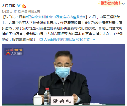 中医药在新冠疫情治疗中起了很大作用,甚至走出了国门。3月23日,张伯礼院士介绍了连花清瘟胶囊在意大利的应用。