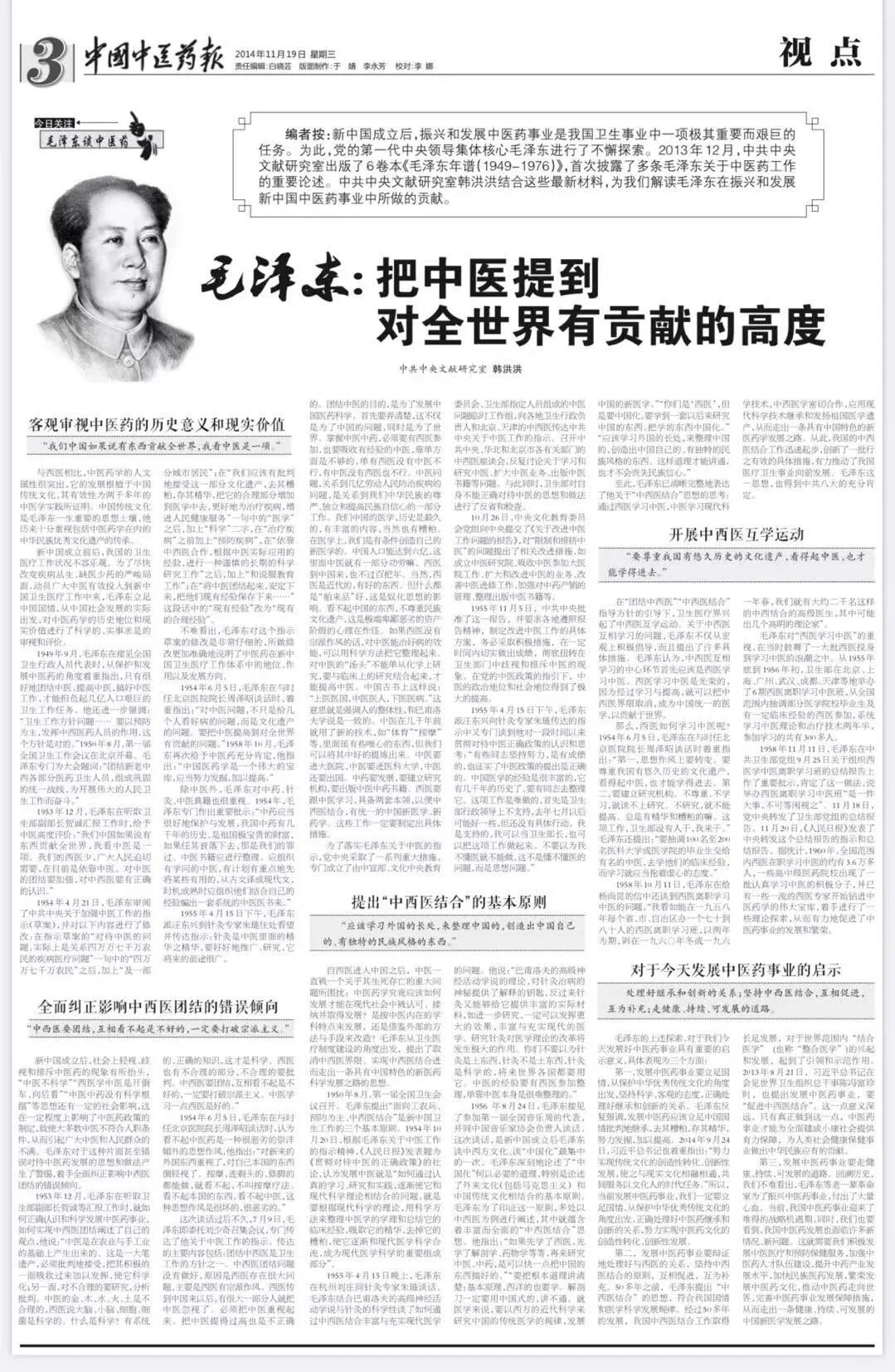 编者按:新中国成立后,振兴和发展中医药事业是我国卫生事业中一项极其重要而艰巨的任务。为此,党的第一代中央领导集体核心毛泽东进行了不懈探索。2013年,中共中央文献研究室出版了6卷本《毛泽东年谱(1949-1976)》,首次披露了多条毛泽东关于中医药工作的重要论述。2014年11月本报刊发了中共中央文献研究室韩洪洪撰写的文章,解读毛泽东为振兴和发展新中国中医药事业所做的贡献。今天,我们谨以此文纪念毛泽东同志诞辰127周年。