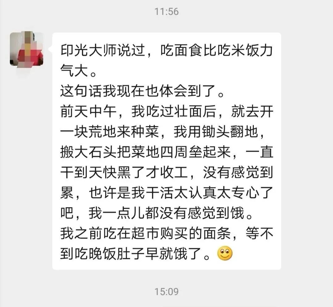 看到大家在分享吃完壮面后的感受,我们也深感高兴。因为壮面,一些人甚至爱上了吃素,这是多好的事情。有位同仁告诉我说,吃素并不是目的,吃素只是一个方法,来连接我们那颗慈悲的心。我听了甚为感动。没想到,一碗素面,竟然包含了这么多的学问,真的是,人生处处皆是修行……
