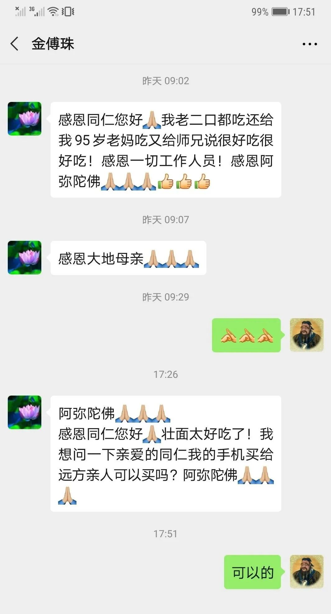 由于空间有限,我们仅截图了一些代表性的回复,以上各位同仁的反馈信息我们看到之后真的也很欢喜。上面有些家人有的是不会买,所有找我们的义工帮助买的,还有很多家人是自己直接买的。相信他们吃过之后也一定会很欢喜。