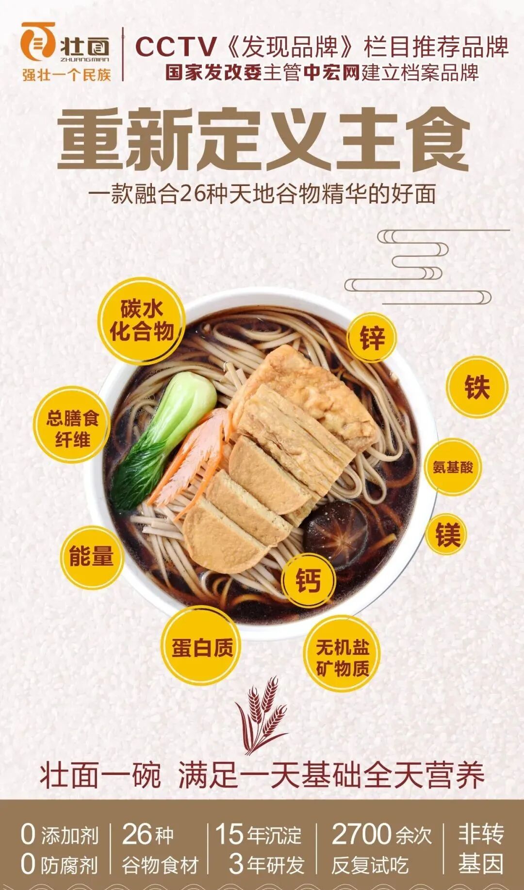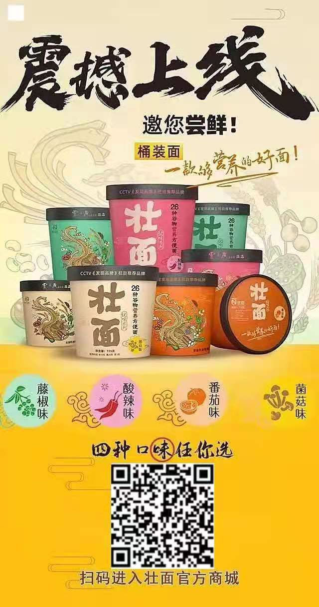 壮面就是以26种五谷杂粮为食材,根据人体每天营养需求,研发出的一款基础全营养方便食品,方便、快捷、简单的解决人体一天基础全营养。