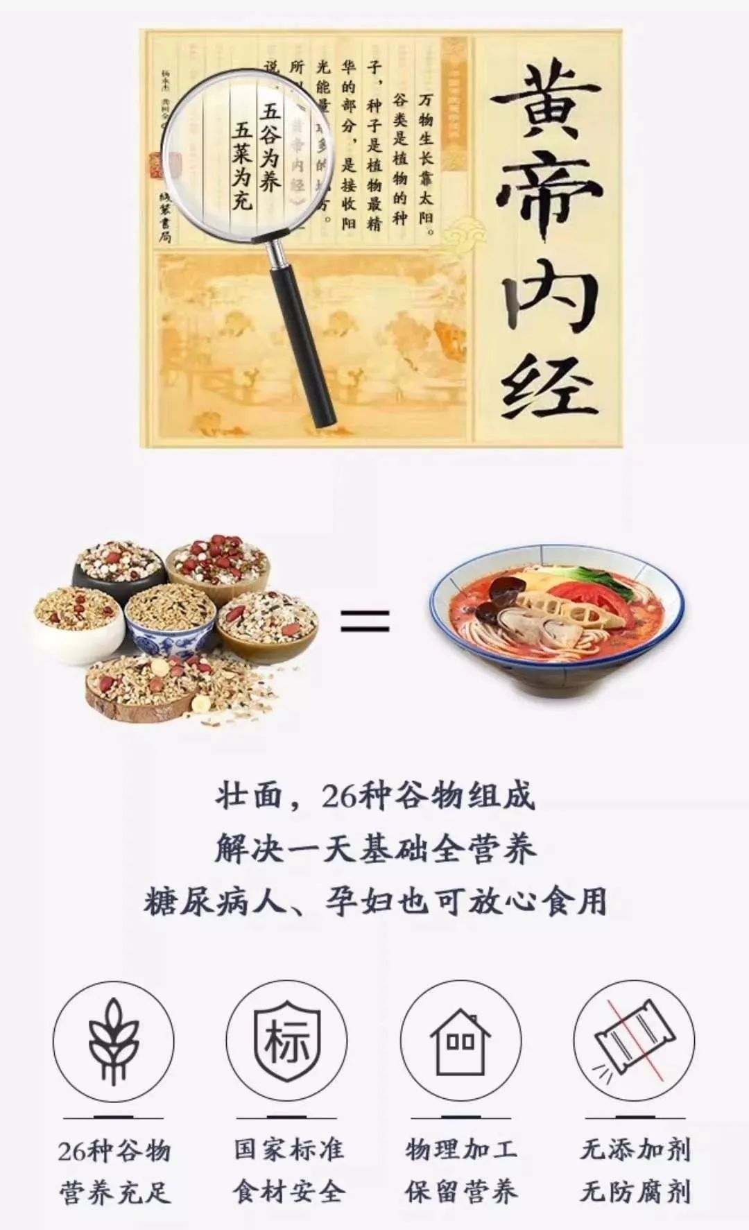 谢先生及其研发团队根据《黄帝内经》五谷为养的理论:五谷杂粮是人类最佳的营养品,也是植物系统中能量最多的部分。于是以五谷杂粮为食材,参考民间饮食习俗,测试了不同的产品形态、食材组合、工艺流程,历经三年,最终根据人体每天营养需求,确定了26种食材组合,做成了现在的壮面!吃一碗就能解决一天基础营养!