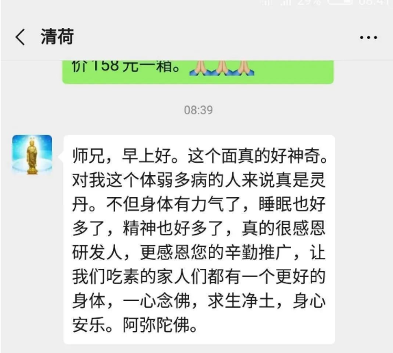 很多同仁看到后,都抱着试一试尝一尝的态度买了一箱,结果吃完以后纷纷给我们回馈,说是这个面太不可思议了。看完家人们给我们的回馈,我们也感到很欣慰,感恩所有付出的人,让我们能够遇到这么好的素食。
