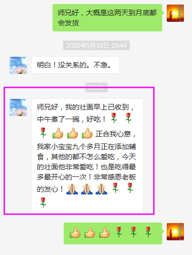 今天,我们为大家挑选了一些买完壮面吃过之后部分家人的留言,请各位同仁看一看。