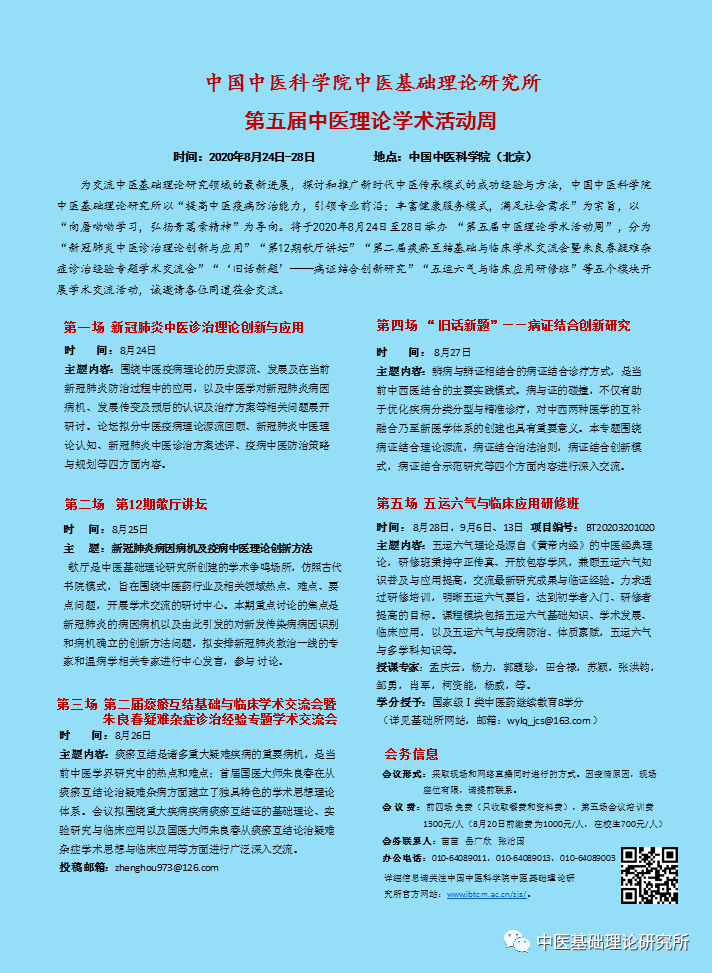 为交流中医基础理论研究领域的最新进展,探讨和推广新时代中医传承模式的成功经验与方法,中国中医科学院中医基础理论研究所以“提高中医疫病防治能力,引领专业前沿;丰富健康服务模式,满足社会需求”为宗旨,以“向屠呦呦学习,弘扬青蒿素精神”为导向,将于2020年8月24日至28日举办 “第五届中医理论学术活动周”,学术周分“新冠肺炎中医诊治理论创新与应用”“第12期欹厅讲坛”“第二届痰瘀互结基础与临床学术交流会暨朱良春疑难杂症诊治经验专题学术交流会”“‘旧话新题’——病证结合创新研究”“五运六气与临床应用研修班”等五个模块开展学术交流活动,诚邀请各位同道莅会交流。