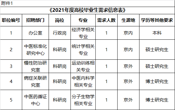 根据工作需要,2021年中国中医科学院中医基础理论研究所公开招聘工作人员7名。现将有关事项公告如下:(二)思想品德端正,遵守中华人民共和国宪法和法律,无违规违纪等不良记录;(三)具有良好的职业道德和团队协作、沟通能力,热爱中医卫生事业;(五)全国普通高等院校统招统分2021年应届毕业生(含两年择业期内未就业的高校毕业生,不含海外留学人员),如期取得毕业证、学位证;(六)具体年龄要求为“本科不超过26岁(1995年1月1日以后出生),硕士不超过30岁(1991年1月1日以后出生),博士不超过35岁(1986年1月1日以后出生)。详见《2021年度高校毕业生需求信息表》(附件1)