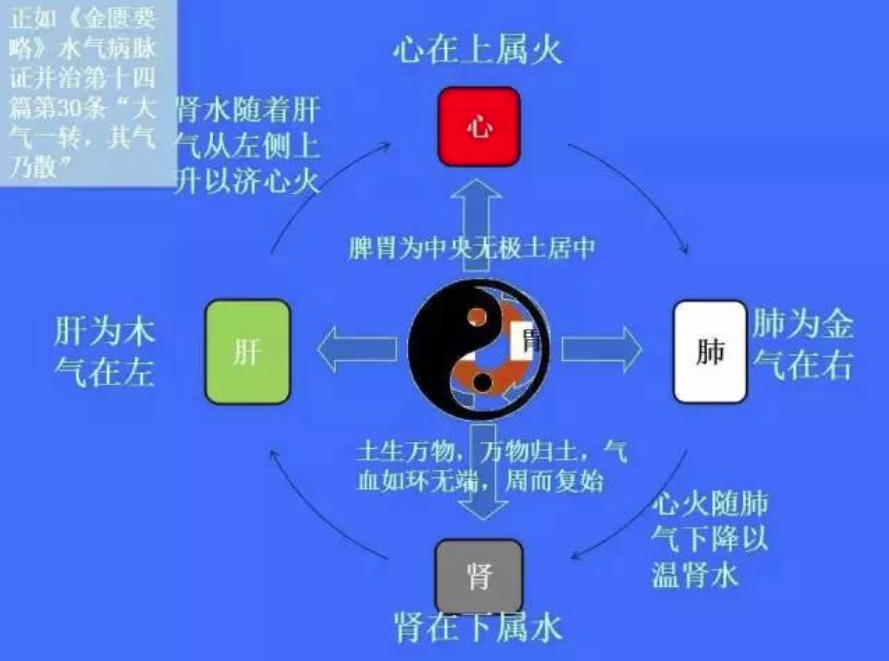 这是我常用的一个五大脏象方位图,还有轮轴辐辏理论。中医认为,脾胃为气机之枢,枢,轴也。肝在左侧,属木;心属火,在上;肾属水,在下;肺属金,在右侧,像一个车轮子一样,在运转。乌梅丸的药物方位按我的理解就是图上这种方向,这个轮子运转的动力的源泉就是肝木,生于水,长于土,化为火,降于金,归于水。我们这个轮子的动力来自两个方面:一个是肝木的一曲一直,推动这个轮的运转;在里面呢,由己土——脾,由左向右运转;戊土胃,由右向左运转,外边的轮子转,里边的轴也跟着转。如果这两个轮子,运转得流畅,人体就不会有病。具体的药物我在这里不再细讲,我的理解就是放在这的,放在这个图上。