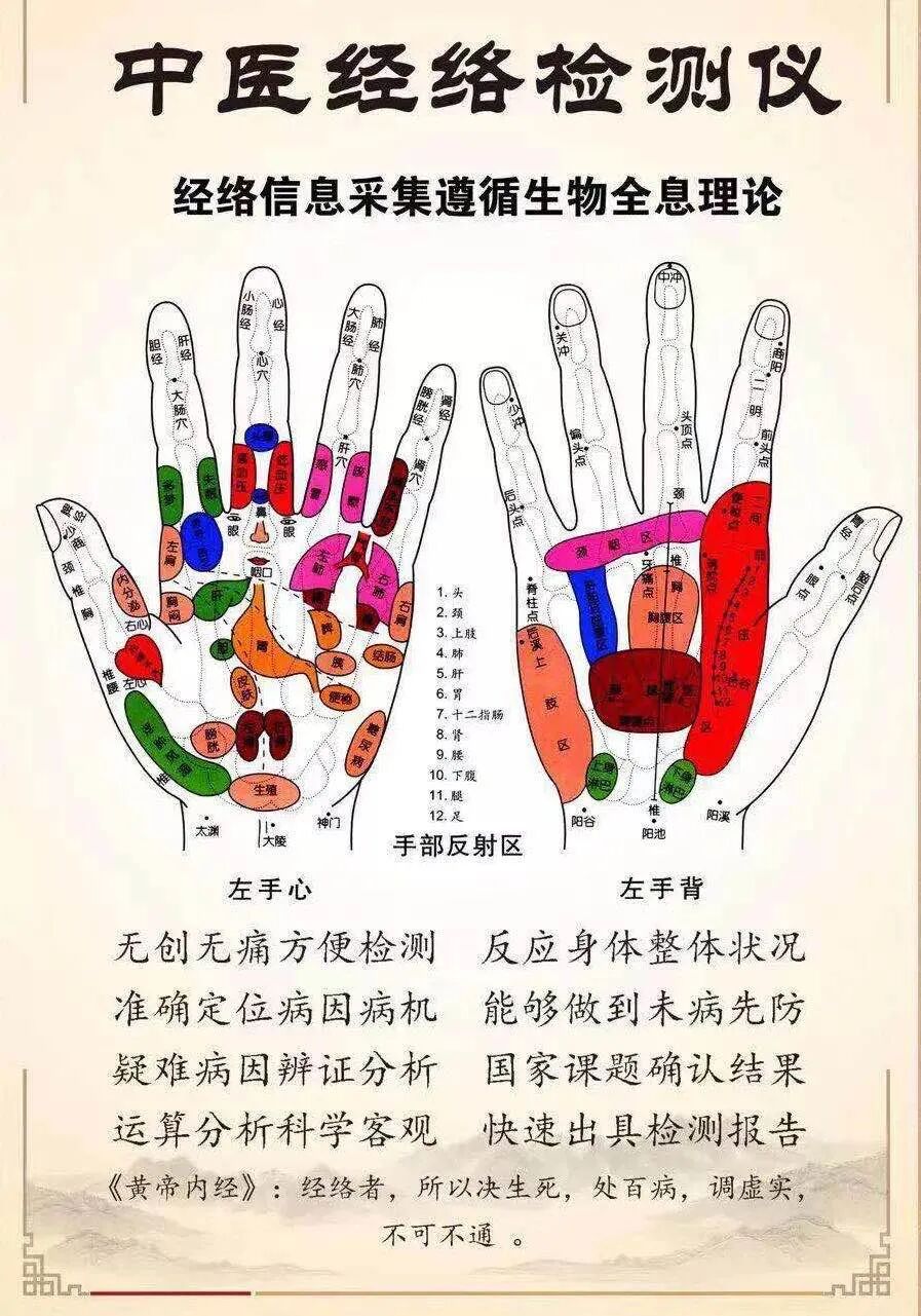 中医经络检测仪是根据中医的人体经络学说,通过掌行检测系统以及智能诊断分析系统,在80s内实现1200次的手部经络反射区的信号采集,以中医经络、现代全息理论等为基础,通过采集人体十二经脉的二十四个穴位的生物电参数,来测定人体的五脏六腑、皮下、组织、细胞等状态,观察整个身体的健康情况。