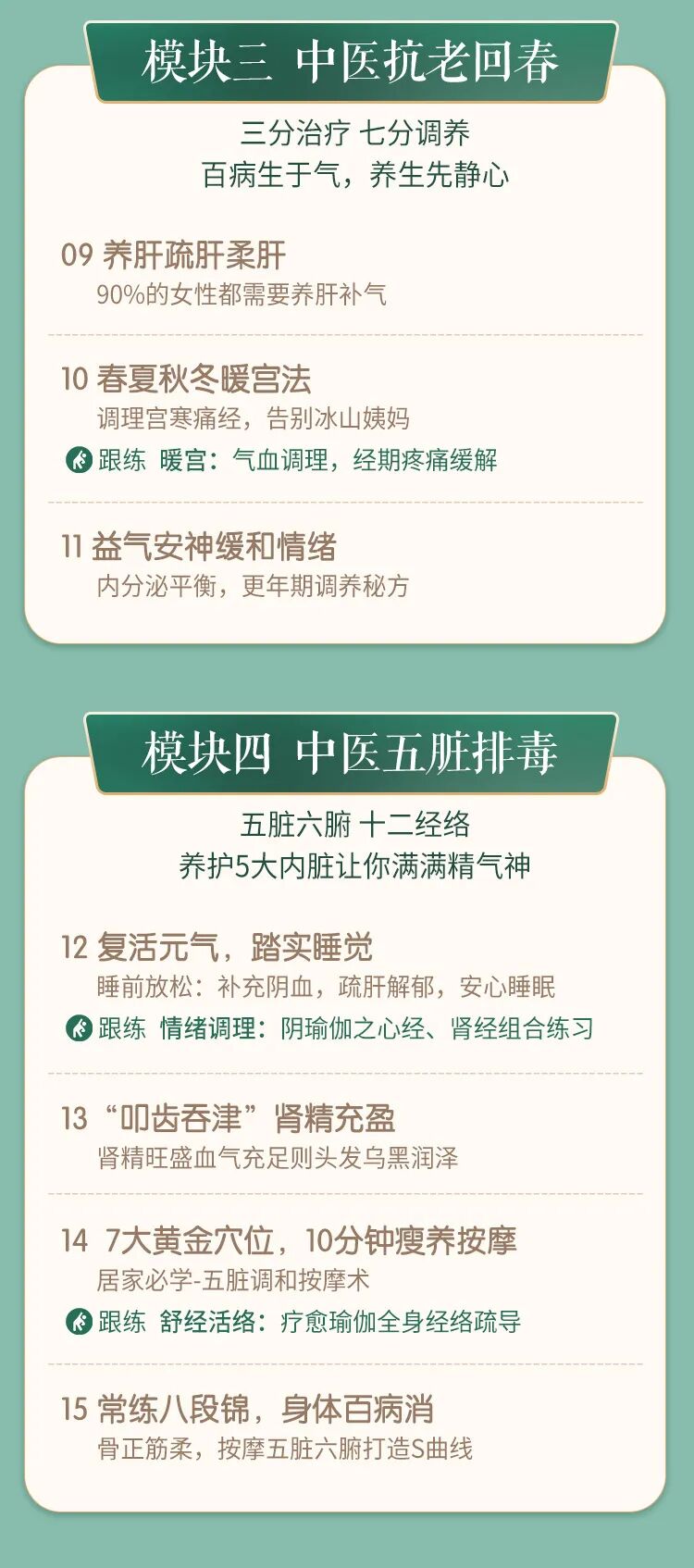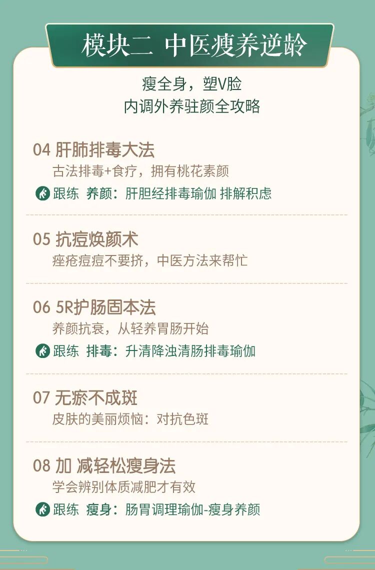 让你从一个没有专业背景,也非出身医学世家的0基础瑜伽老师,却可以像经验丰富的专业医者一样将中医经典疗法融入瑜伽,帮助会员养生保健、抗老逆龄,解决西医无法治愈的常见亚健康疾病。中医养生中医理论按钮即可购买