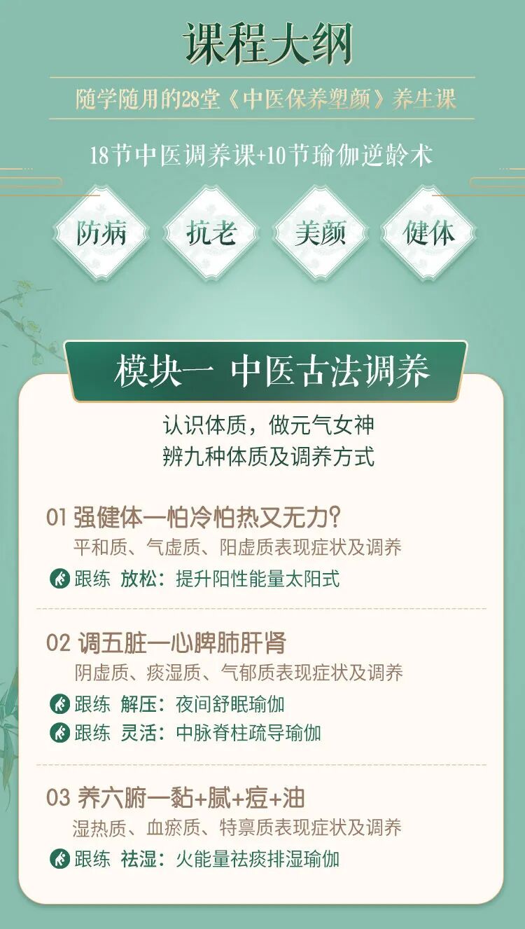 殊不知,在瑜伽习练中,结合中医经络养生理论,把呼吸看成身心连接的介质,更能把呼吸作为经络锻炼和意念引导手段,调养气血,疏通经络,滋养五脏,从根上减龄驻颜:排毒祛瘀:在一呼一吸中疏通三脉七轮 ,排出脂肪和毒素,让脸色更加红润光泽,让身材更苗条。活血滋养:通过坐立、仰卧、扭转等体式按摩和挤压内脏器官,促进血液循环,重焕五脏子宫活力。形体逆龄:简单支撑、拉伸动作矫正弯曲的脊柱,放松紧张的肌肉,使身体柔韧度变好,体态恢复优雅。如果瑜伽老师能够运用中医瑜伽的三大法:经络+饮食+瑜伽,跳出传统瑜伽以练习为唯一手段的教学和理疗方法,使场馆具有区别于普通场馆的专业产品。不仅能增加与客户之间的信任与长期粘性,还能使瑜伽老师与场馆拥有绝对的市场竞争力与保有率。这也是众多瑜伽老师开始学习中医来丰富自己的瘦身/驻颜主题课程的原因,但是在学习过程中总是遇到这些问题:针对这些问题,随心瑜大学专门邀请到出身中医世家、医脉传承近230年、北京中医药大学研究生院全科医学系硕士—吴羿姗老师精心录制了一套【0基础学中医瑜伽】课程,10节中医调养+10节瑜伽成品训练。