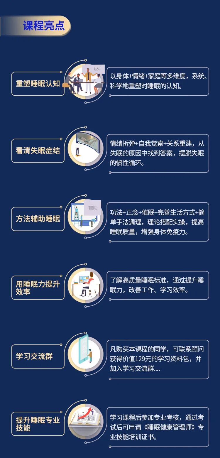 这些年来,对于健康,肖然老师搭建了一套属于自己的认识体系。他认为,「在一个人的健康不是当下得到的,而是随着日子积累出来的。健康绝不是吃药,更不是看病,而是一种生活方式,一个重新了解自己的过程。」要想解决睡眠障碍问题,先要多维度地、系统地、科学地重塑我们对睡眠的认知,找到失眠症结。随后,再借由功法、正念、催眠、完善生活方式、简单手法调理……理论搭配实操,一步步摆脱失眠的惯性循环,提升睡眠力。这也正是《睡眠健康管理师·初级班》想要达到的目的。