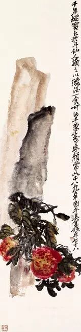 《寿石图》作于1921年。中国古代有千年寿桃之说,亦即说天上仙桃“三千年一开花、三千年一结果”,是世间凡人梦寐以求的长寿之果。以千年桃食来表现献寿内容,吴昌硕是首创,后来愿为吴昌硕“门下走狗”的齐白石也这么画。此幅为缶翁晚年之精品,为其画桃的代表作,诚如画中落款所言:“千年桃实大如斗,仙人摘之以酿酒。一食可得千万寿,朱颜长如十八九。”是可以留赠子孙的传世佳作。