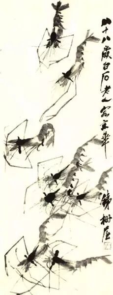 齐先生在画虾上有重要的三段变法:第一阶段是如实画来,写实,宗法自然,更像写生;第二阶段最重要,不算“零碎”,虾身主体简化为九笔。所谓“零碎”一共是八样:双眼、短须、长须、大钳、前足、腹足、尾,还有一笔深墨勾出的内腔,这种结构便是齐白石的虾所独有的重要风格;第三阶段是画上的墨色不均一,笔先蘸墨,然后用另一支笔在笔肚上注水,把虾的“透明”画了出来,虾一下子就活了。