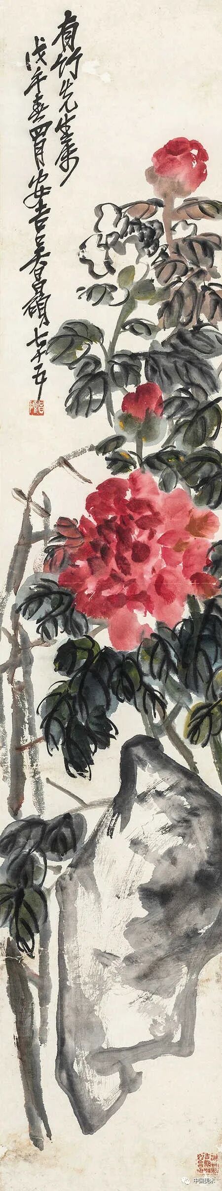 吴昌硕常常用墨色和红色画牡丹,并充分发挥墨色的效能,使其色彩的变化非常复杂,对比强烈,达到淋漓尽致的程度。