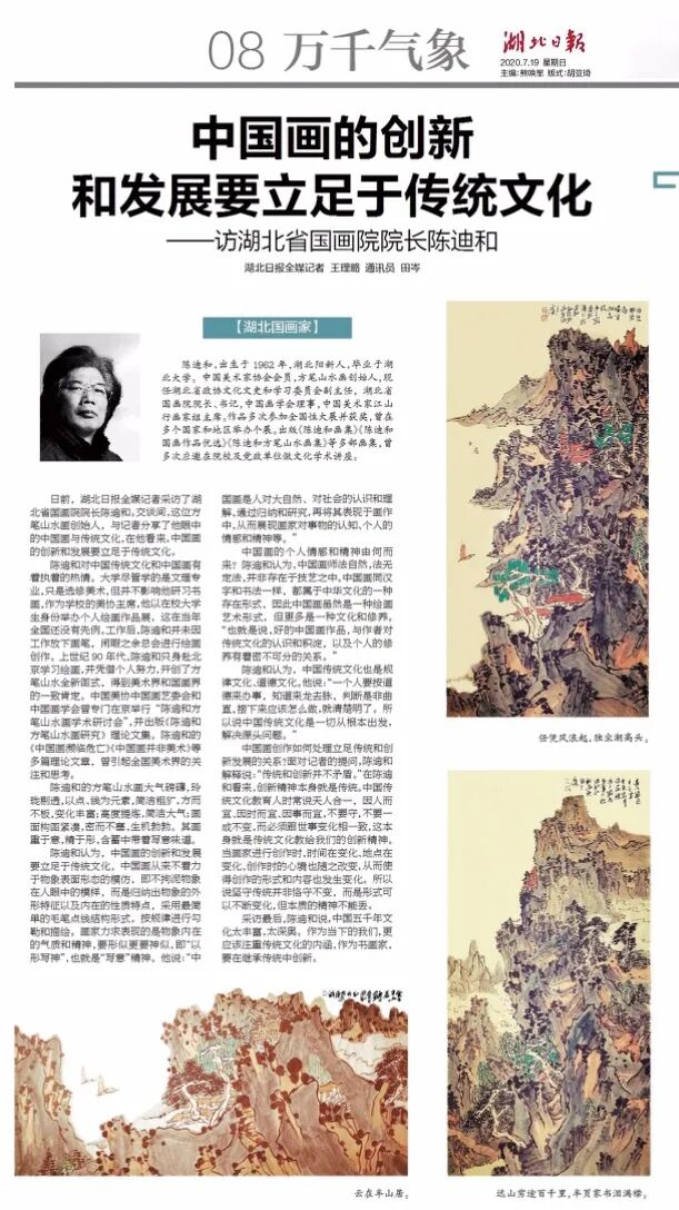 7月19日,《湖北日报》刊专版介绍湖北省政协文化文史和学习委员会副主任,湖北省国画院院长陈迪和,发表了记者专访文章“中国画的创新和发展要立足于传统文化”。经同意现转发以飨读者。【陈迪和】出生于1962年,湖北阳新人,毕业于湖北大学。中国美术家协会会员,方笔山水画创始人,现任湖北省政协文化文史和学习委员会副主任,湖北省国画院院长、书记,中国画学会理事,中国美术家江山行画家组主席。作品多次参加全国性大展并获奖,曾在多个国家和地区举办个展。出版《陈迪和画集》《陈迪和国画作品优选》《陈迪和方笔山水画集》 等多部画集,曾多次应邀在院校及党政单位做文化学术讲座。