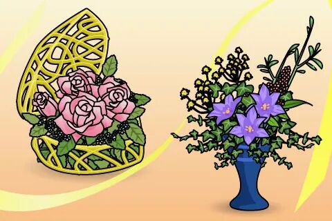 生花,是作为装饰在茶室壁龛里的插花而诞生。重视花本身的美,表现植物自然生长的姿态,给人一种静谧和优美感。不拘泥于传统形式,按照人的自由想法进行插花的方法。自由花作为桌花和活动展示,效果最好,直接表现出插花者的感性。是在细长花瓶上插花的方法,被认为是基本的插花方法。通过使用各种花草,表现颜色和形状和谐统一,是大型华丽的艺术表现。| 赏花的方式