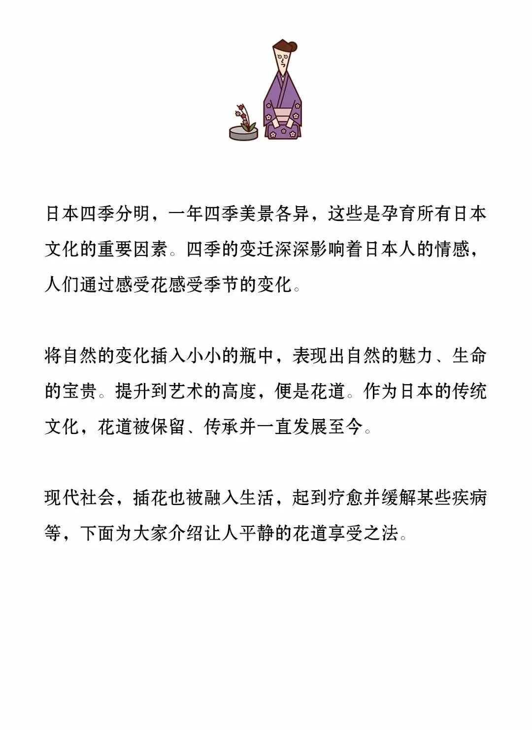 通过插花来重新认识花的美妙和生命的珍贵,这是在历史和传统中培养出来的礼仪。掌握礼节是一种精神锻炼,对培养丰富的人性也有很大的作用。